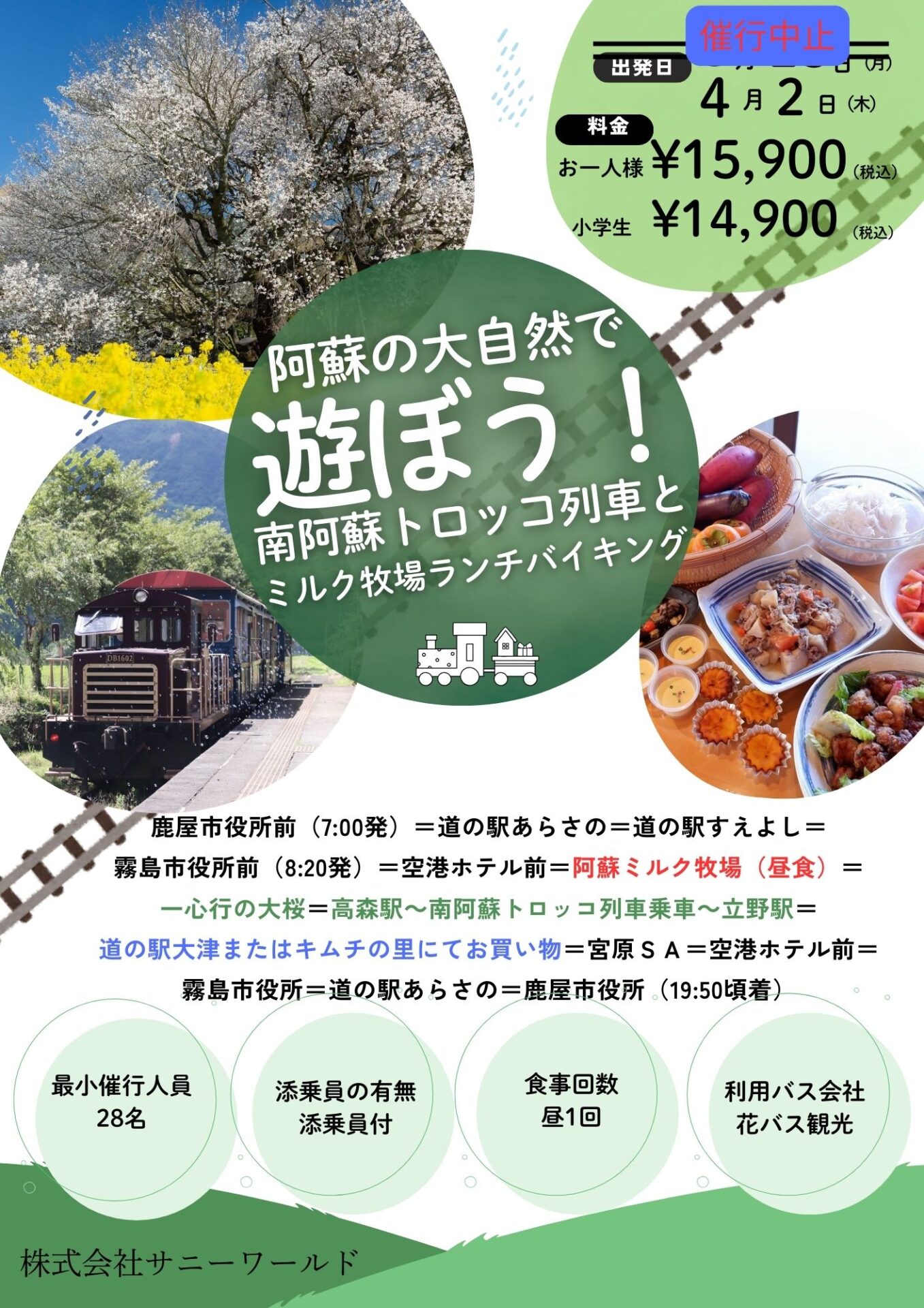 4月2日(木)出発の「南阿蘇トロッコ列車とミルク牧場ランチバイキング」ツアーが、