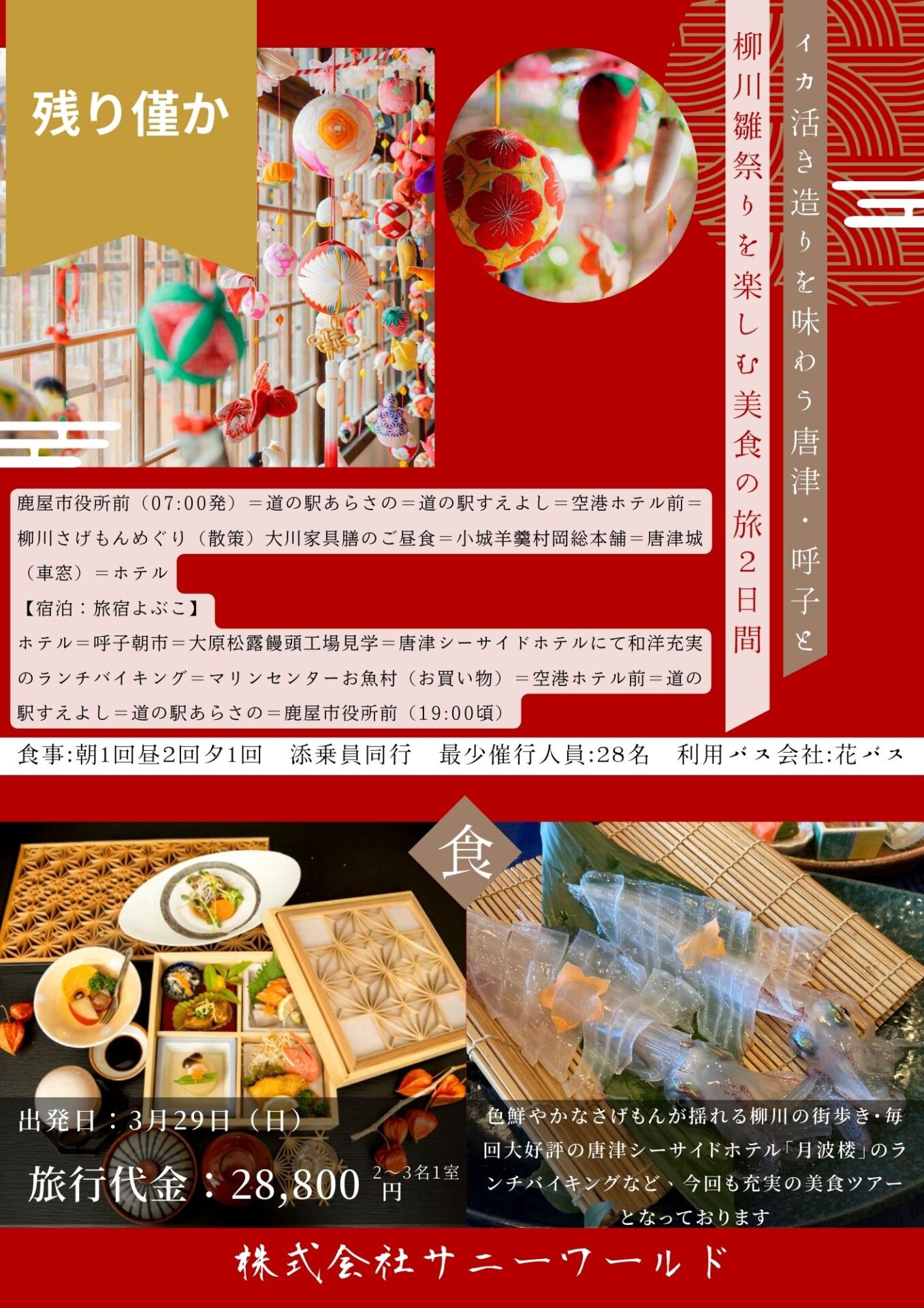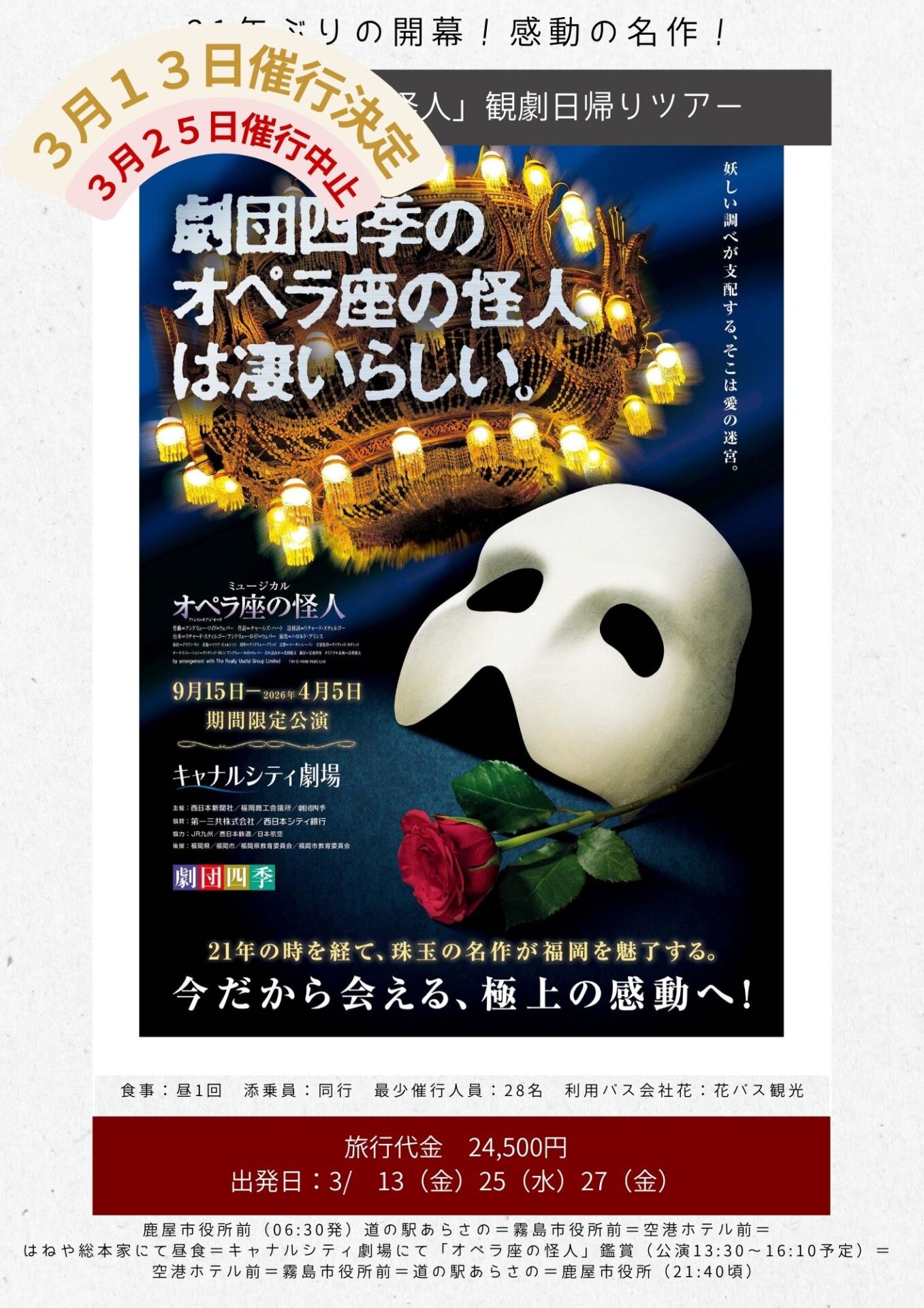 21年ぶりの開幕!感動の名作「オペラ座の怪人」観劇日帰りツ... 日帰り食べる見る国内 唐津・呼子 イカ活き造りと柳川雛祭り 美食の旅2日間 泊まる食べる見る国内 わけあって延岡・今延岡が面白い! 高千穂神楽貸切公演と延岡... 泊まる食べる見る国内 長崎ランタンフェスティバル&柳川おひなまつり 泊まる食べる見る国内 柳川雛祭り おひな様水上パレード鑑賞&いちご食べ放題|限定... 日帰り食べる見る国内 久留米巨大しだれ桜と世界のつばき館 筑紫平野を見渡す料亭淨... 日帰り食べる見る国内 世界の料理ワールドバイキングと久留米「世界のつばき館」 日帰り食べる見る国内 臼杵とらふぐフルコースと大友宗麟城下町めぐり 日帰り食べる見る国内 阿蘇の大自然で遊ぼう!南阿蘇トロッコ列車とミルク牧場ランチ... 日帰り食べる遊ぶ見る国内 お花まみれ春の宮崎へガーデニングと西都原お花見/宮崎観光ホ... 日帰り食べる見る国内 投稿のページ送り 1 2