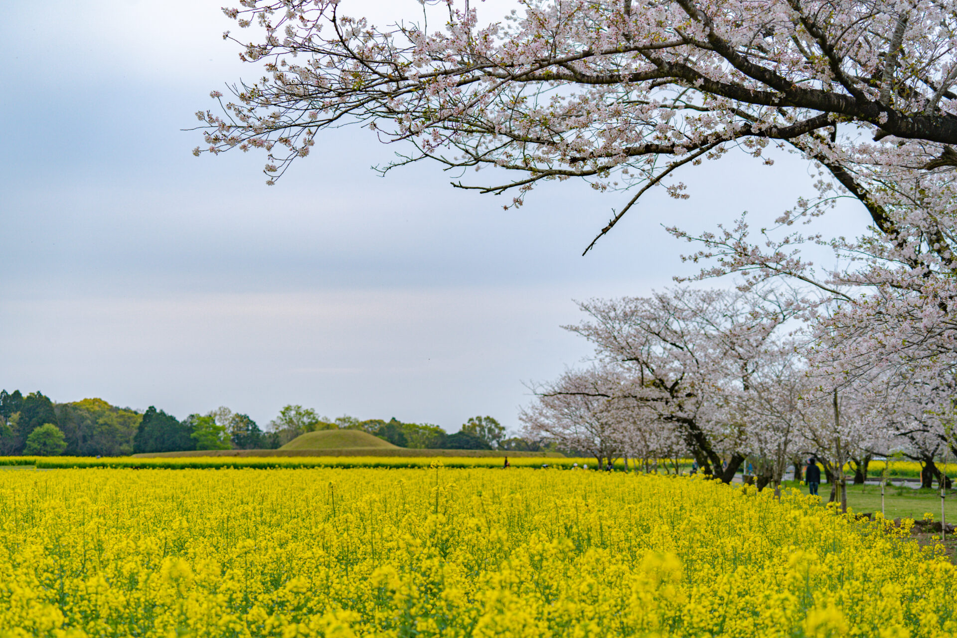 日本最大級の古墳群として知られる「西都原古墳群」。日本遺産にも認定されており、東西約2.6km、南北約4.2kmに及ぶ広大な台地に300基以上もの古墳が点在しています。一帯は公園となっており、古代の雰囲気を味わいながら散策やレクリエーションを楽しめる憩いの場として多くの人々に親しまれているスポットです。春には桜や菜の花、夏にはひまわり、秋にはコスモスと、四季折々の花で彩られます。