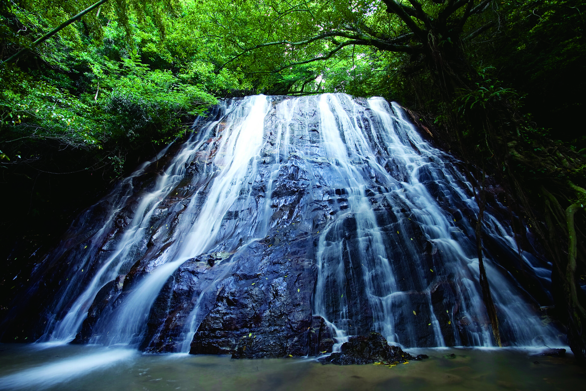 苔むす岩肌を流れ落ちる滝が美しい癒しの名所。島の自然の静けさと清涼感を感じられるスポットです