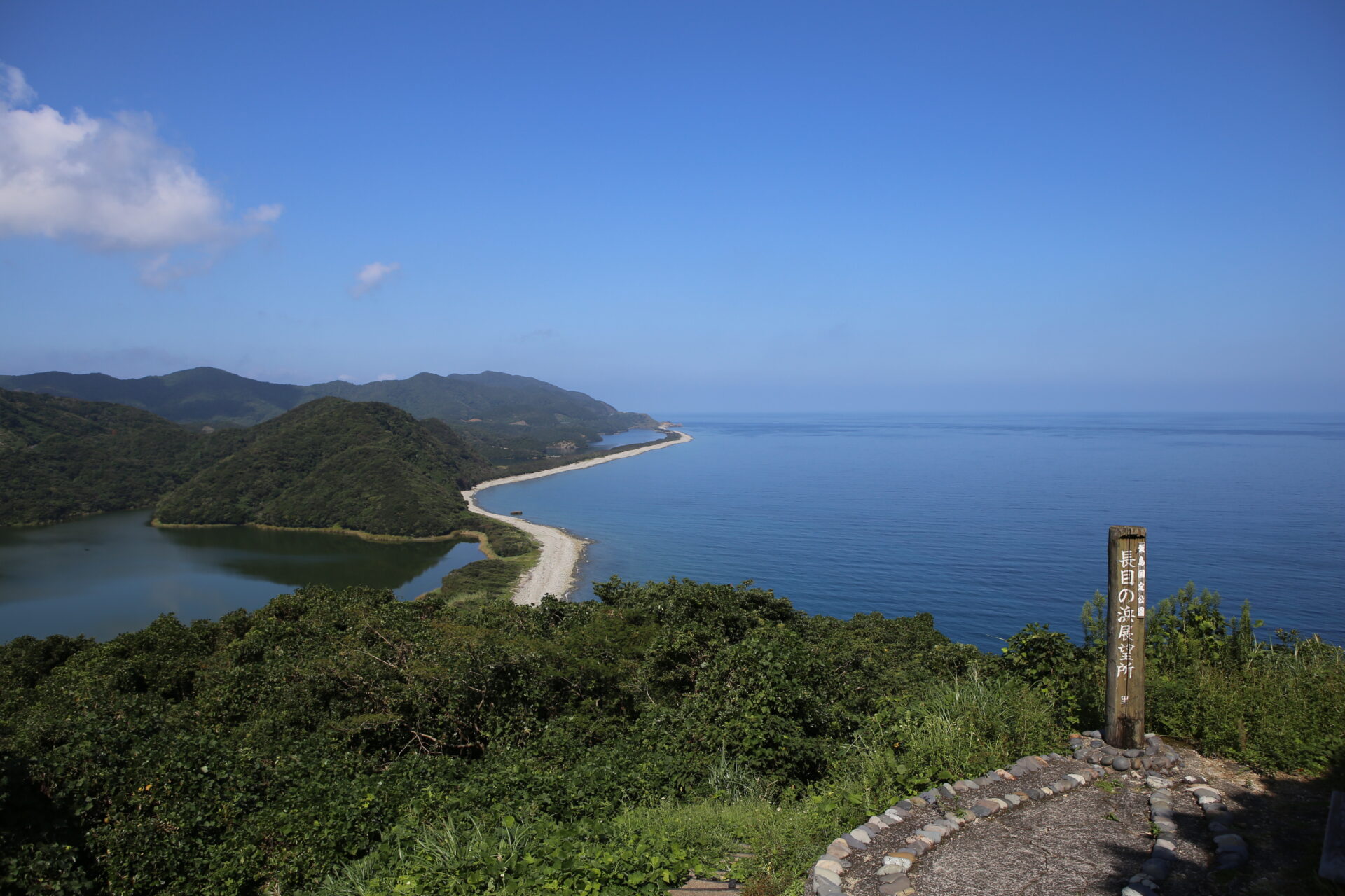 海・汽水湖・淡水湖が一直線に並ぶ、全国的にも珍しい砂州景観。甑島を代表する絶景で、自然の造形美を一望できます。