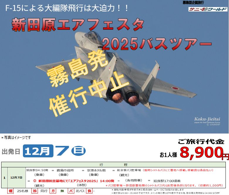 出発日:12月7日(土)鹿屋発・姶良・霧島発