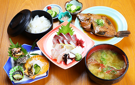 ご昼食は長島の新鮮な海の幸を使用した豪華海鮮御膳。旬の味覚を堪能できるのもこの旅の魅力です。さらに、赤巻2種と島みかんサイダーのお土産付き。